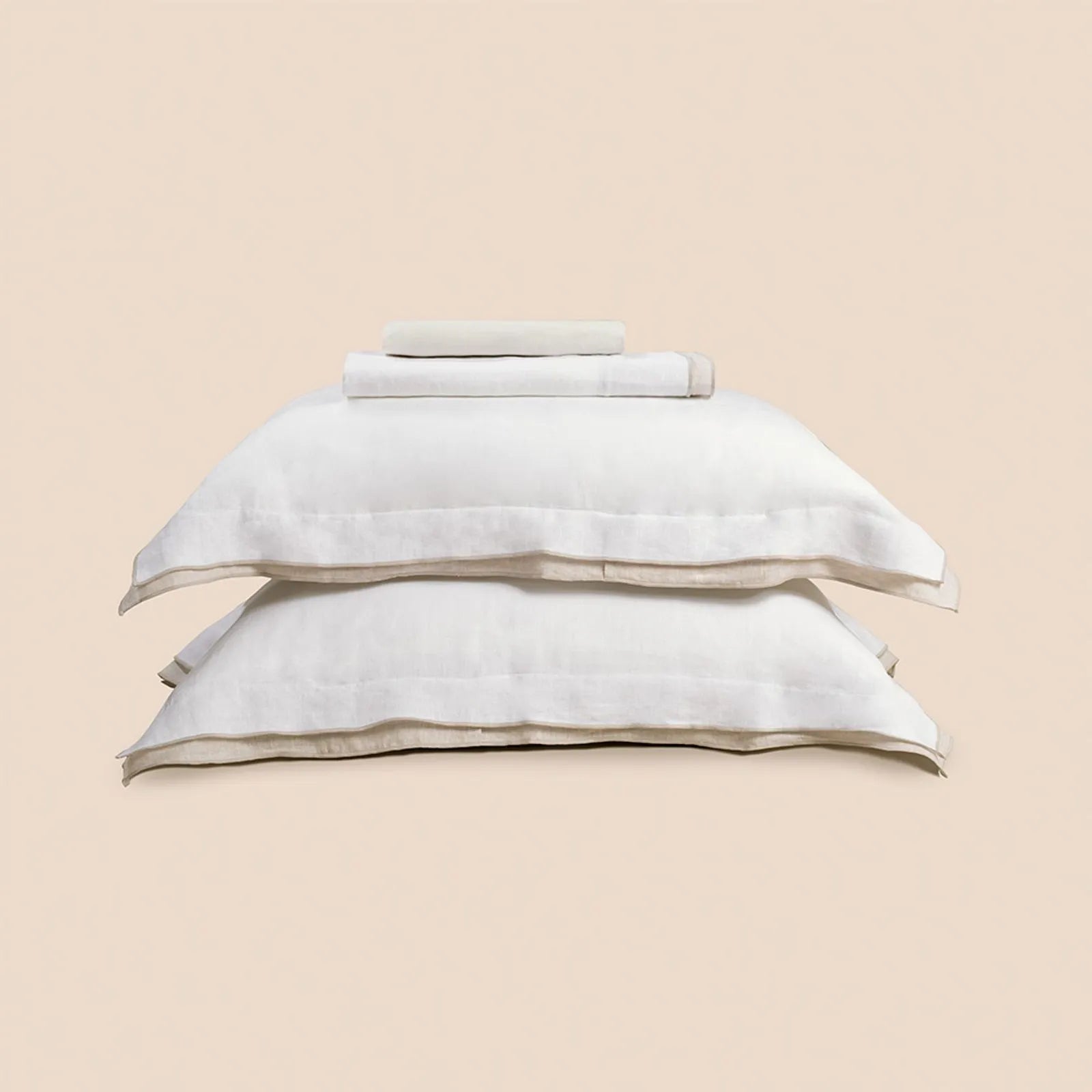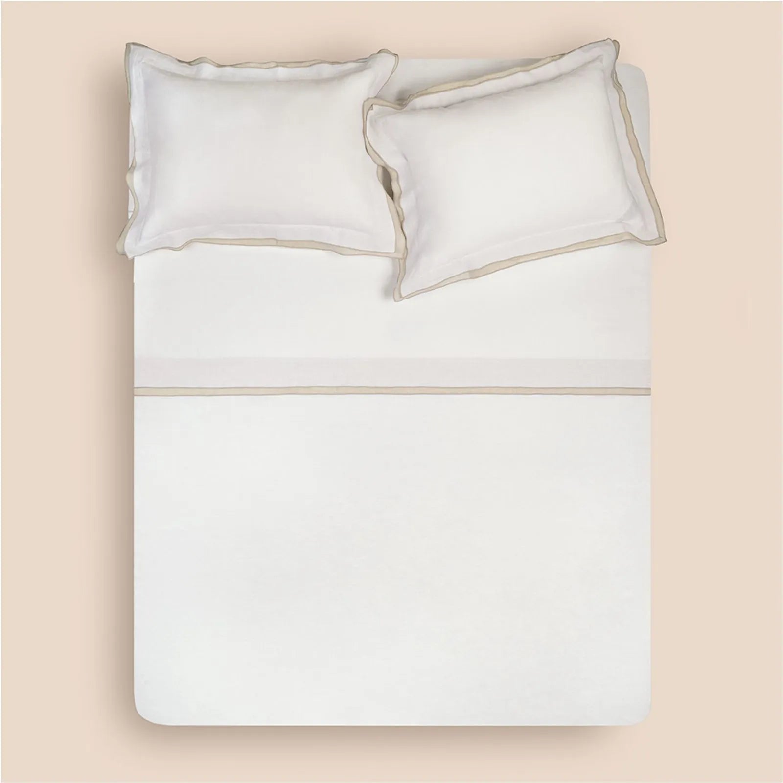 Fronhas Dupla Face com 4 Abas: Possuem abas de 7cm e acabamento bicolor (Branco no lado superior e Linho Natural no inferior), permitindo variações sofisticadas na montagem da cama;