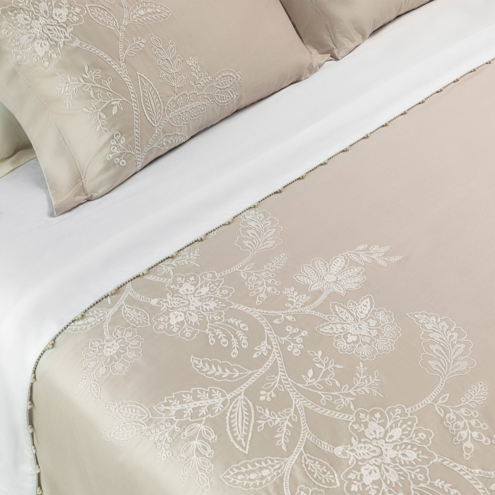 • Design Elegante: Bordado floral delicado na parte superior da colcha e nas fronhas, evocando jardins em flor.