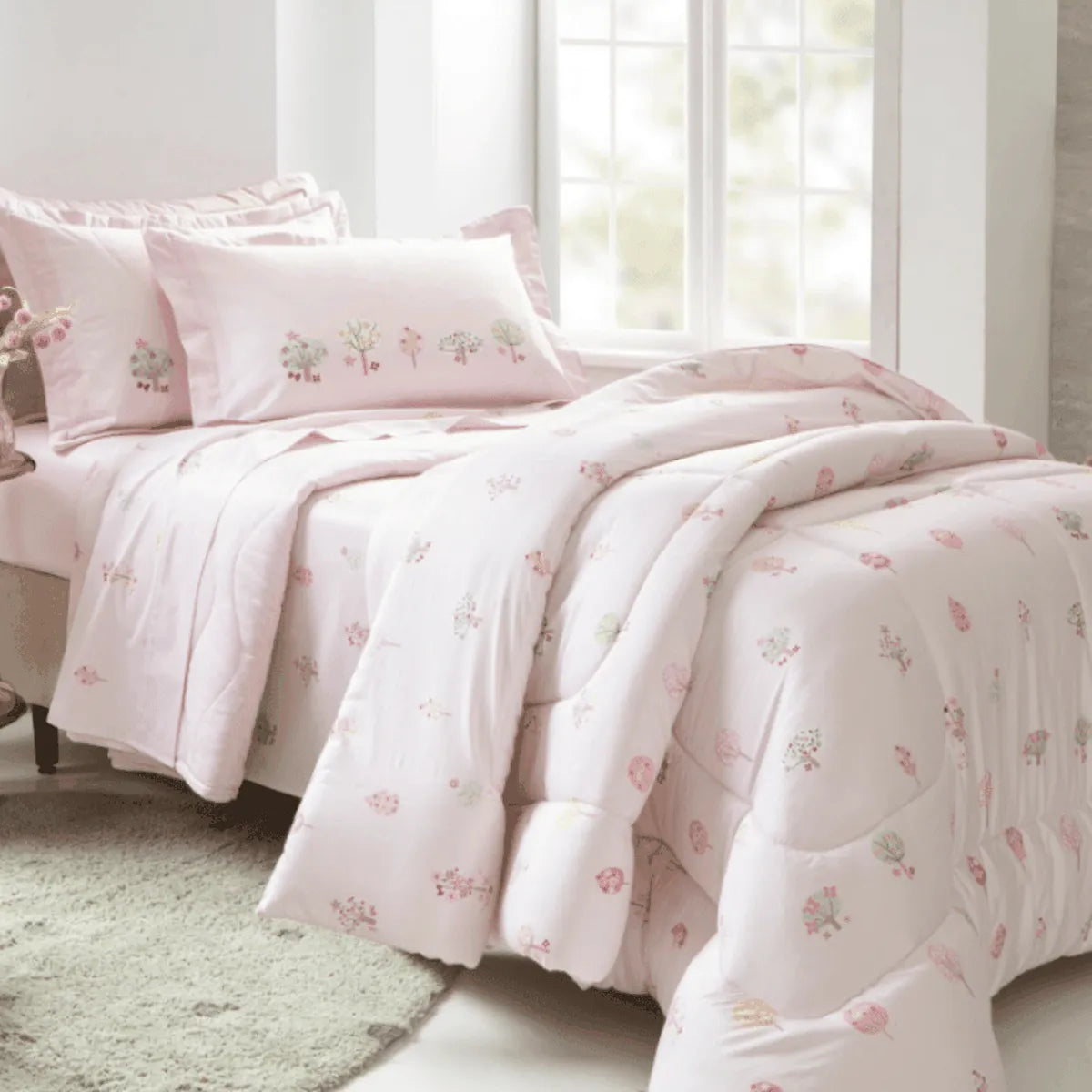 O Cobreleito Amel, da prestigiada linha Satinée da Kacyumara, é a tradução da elegância e do frescor para o dormitório. Sua estampa Amel apresenta uma proposta encantadora e graciosa, com ilustrações de árvores em tonalidades alegres e delicadas que desenham o padrão de maneira primorosa. É a peça ideal para quem busca um ambiente leve e revigorante, unindo a sofisticação do toque acetinado a um design que celebra a natureza com suavidade e bom gosto.