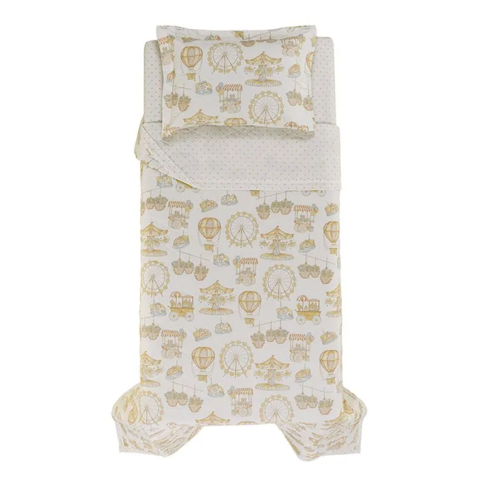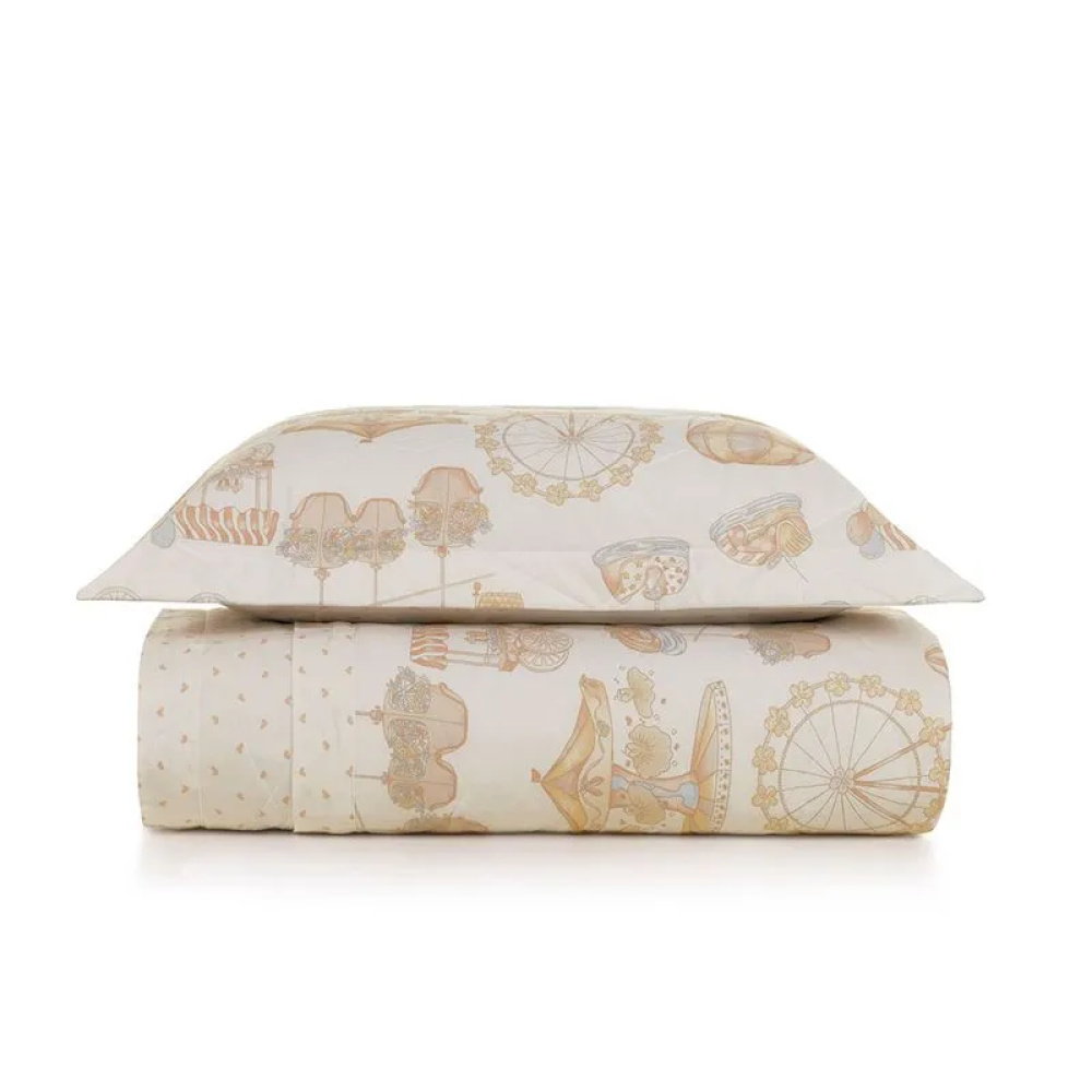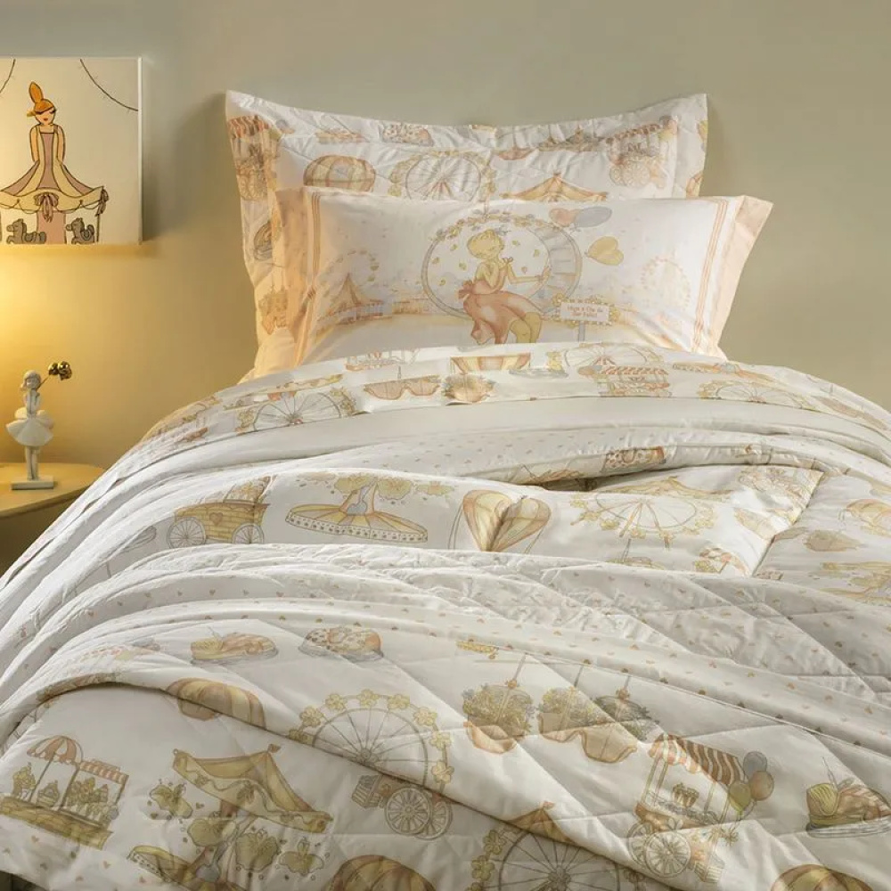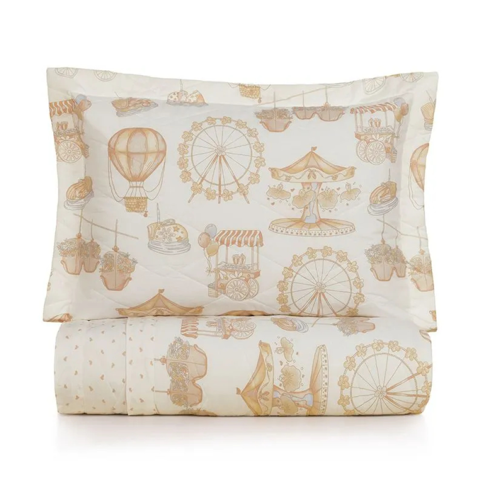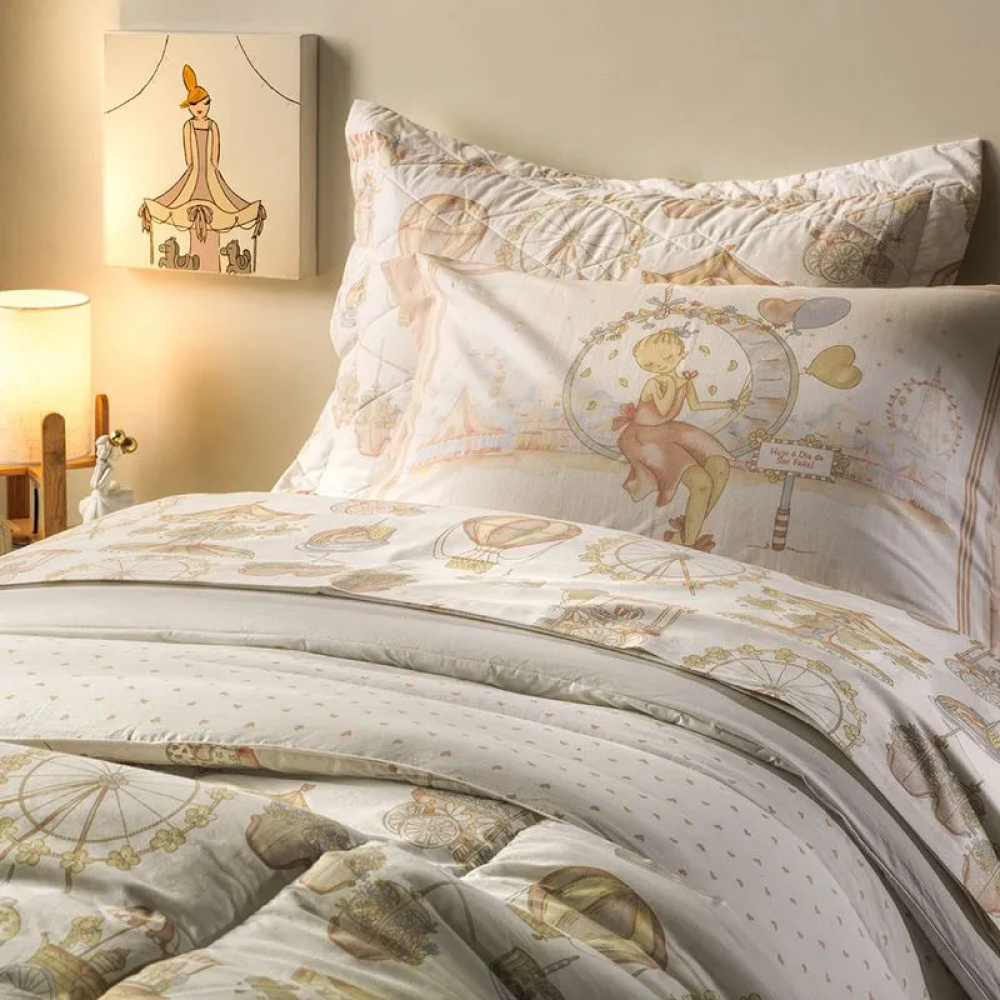 A colcha é Dupla Face, com cantos quadrados, permitindo versatilidade na decoração. Um diferencial encantador é a aplicação de glitter em certas áreas da estampa, que adiciona um toque mágico e divertido. O jogo pode ser facilmente combinado com o edredom e o jogo de cama da mesma Coleção Instantes.