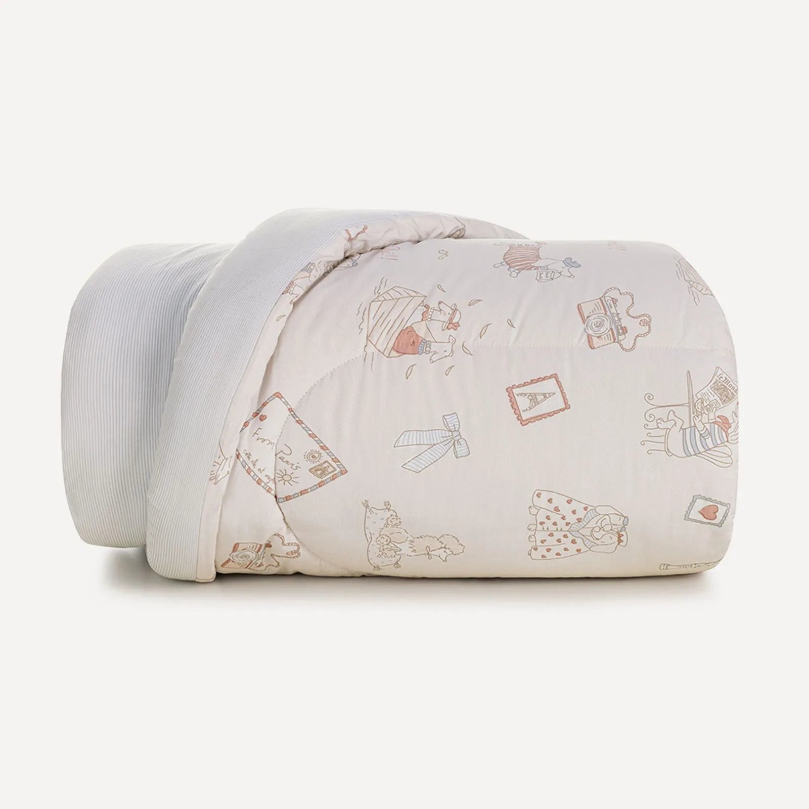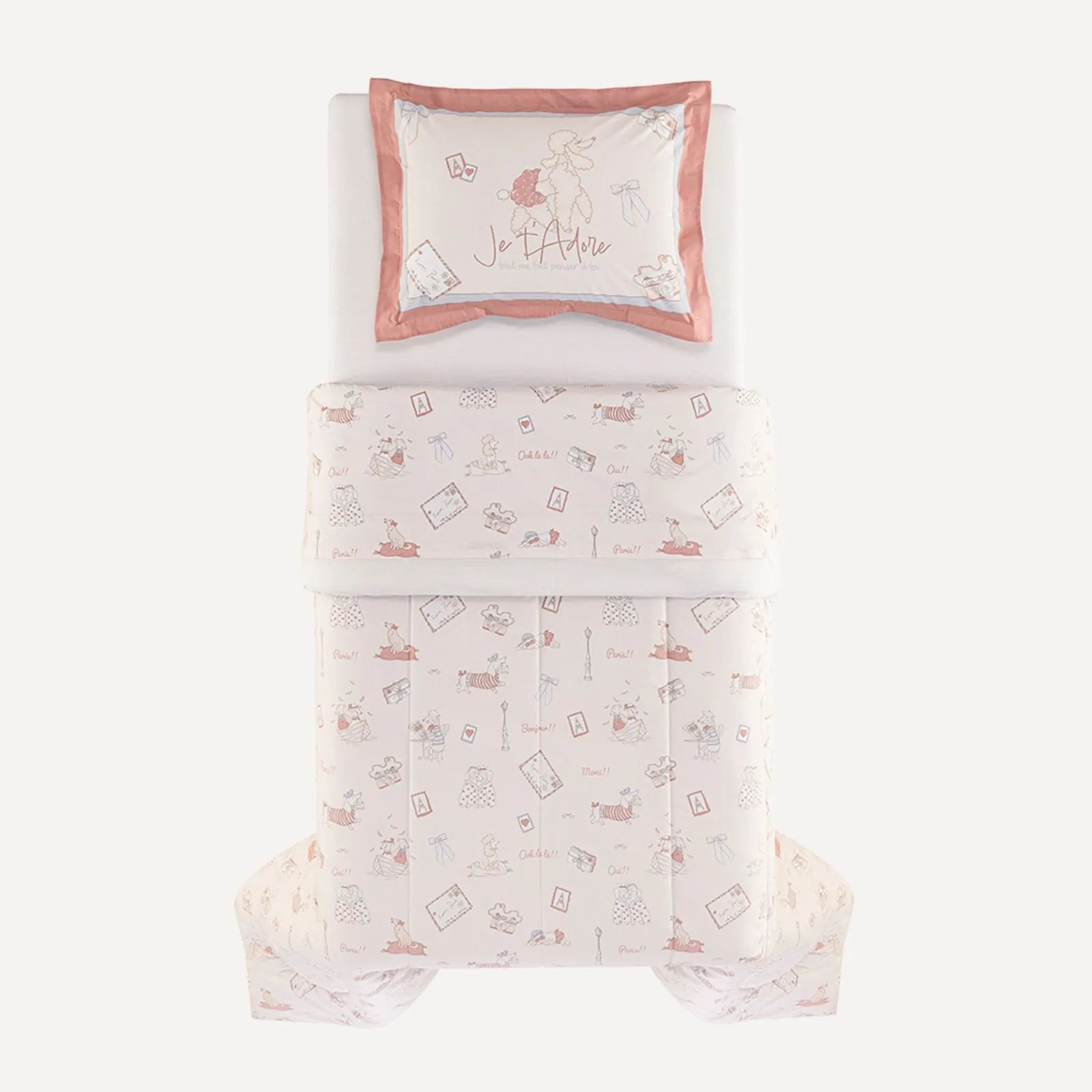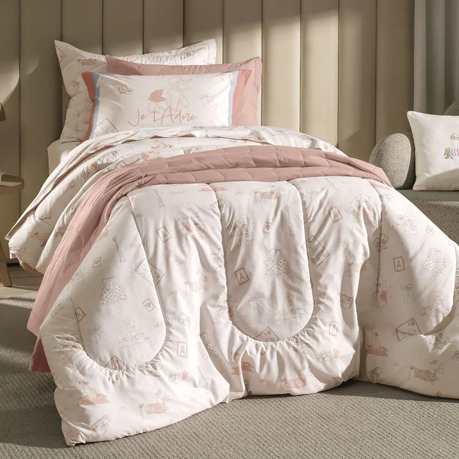 O Edredom Solteiro Jolie, da linha Karsten Kids, é o aliado perfeito para noites de sono repletas de aconchego e sonhos encantadores. Com uma estética que une a delicadeza parisiense à modernidade, a peça é dupla face: de um lado, apresenta uma estampa lúdica com cachorrinhos, laços e elementos de Paris em tons suaves de rosa; do outro, uma padronagem listrada azul e branca, permitindo variar a decoração do quarto com facilidade e sofisticação. Sua estrutura matelassada confere volume e um visual fofinho, transformando a cama em um verdadeiro refúgio.