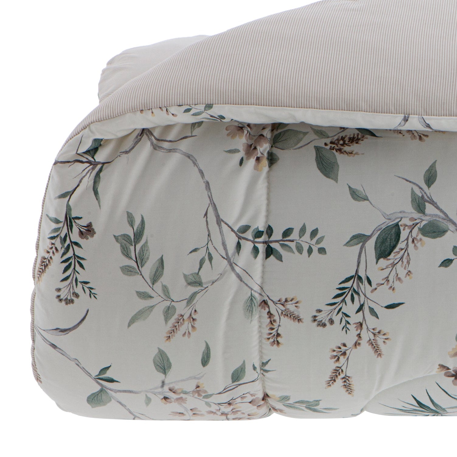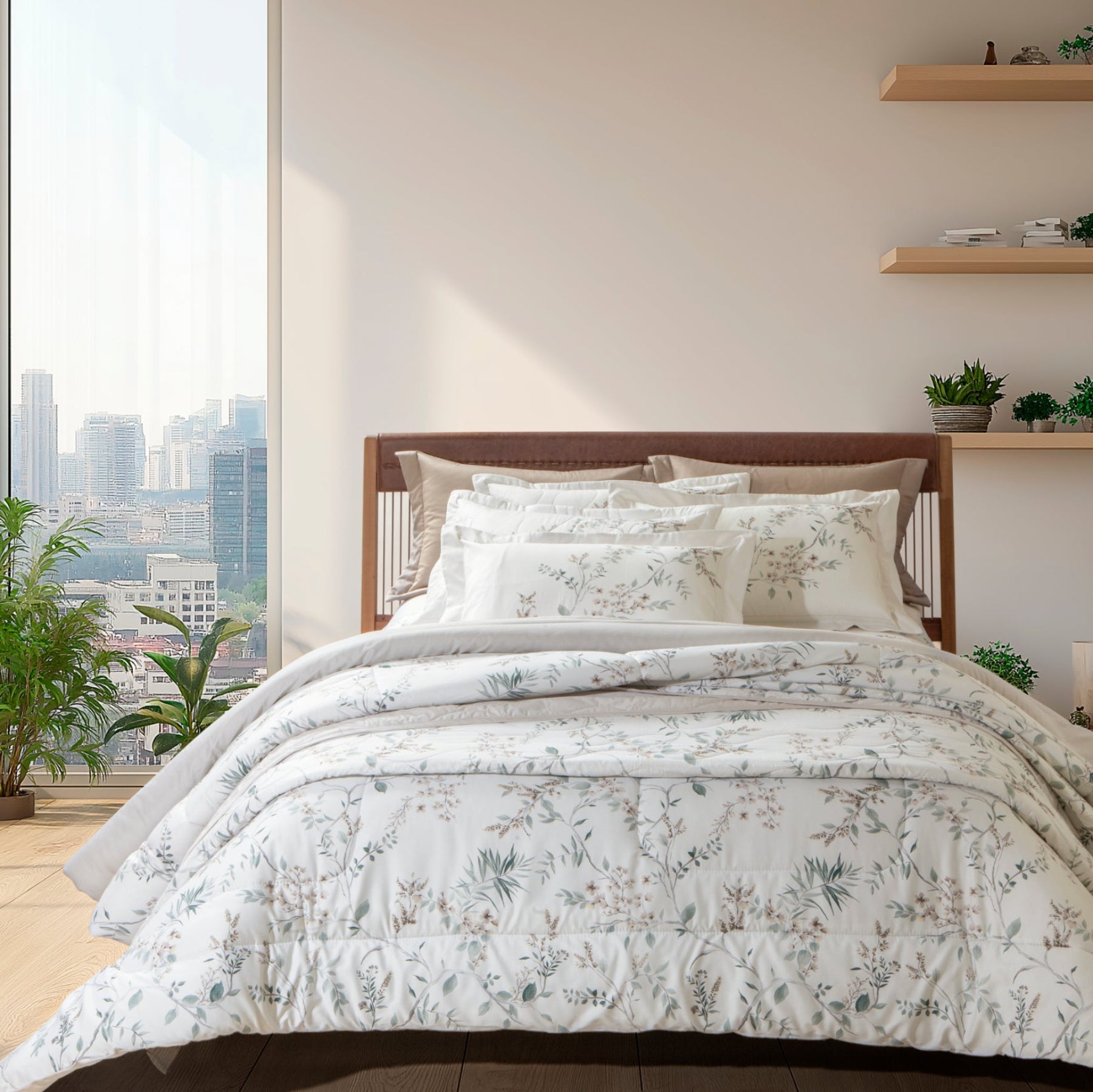 O Edredom Tulia, da prestigiada linha Satinée da Kacyumara, é a tradução da elegância botânica aliada ao conforto excepcional. Projetado para transformar o quarto em um refúgio de serenidade, este modelo destaca-se por sua estampa herbal delicada em tons suaves, que contrastam harmoniosamente com o fundo off-white. Com um design que transita entre o clássico e o contemporâneo, o edredom Tulia proporciona um visual leve e requintado, garantindo um caimento impecável que valoriza toda a decoração da cama posta.