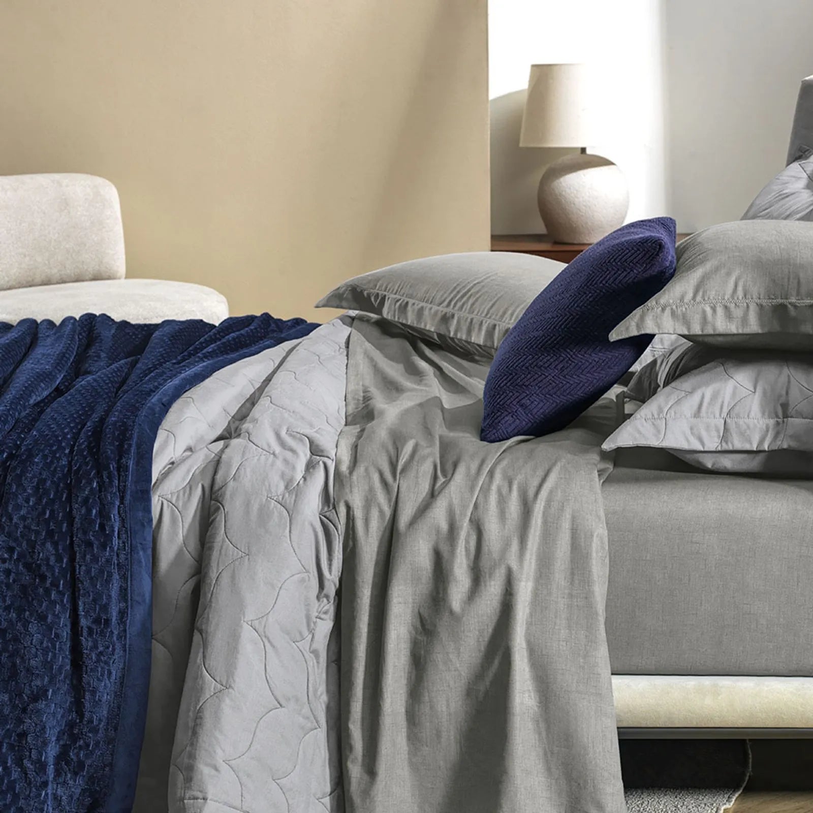 O Jogo de Cama Tesso, da Coleção Despertar da Karsten, é uma homenagem à arte da tecelagem, buscando inspiração no termo latino texere. Seu design contemporâneo apresenta uma estampa que simula tramas naturais e texturas de riscas irregulares em tons de cinza, proporcionando um visual sóbrio, moderno e extremamente versátil. É a peça ideal para quem deseja um dormitório com estética urbana e minimalista, sem abrir mão da sensação de acolhimento e naturalidade.