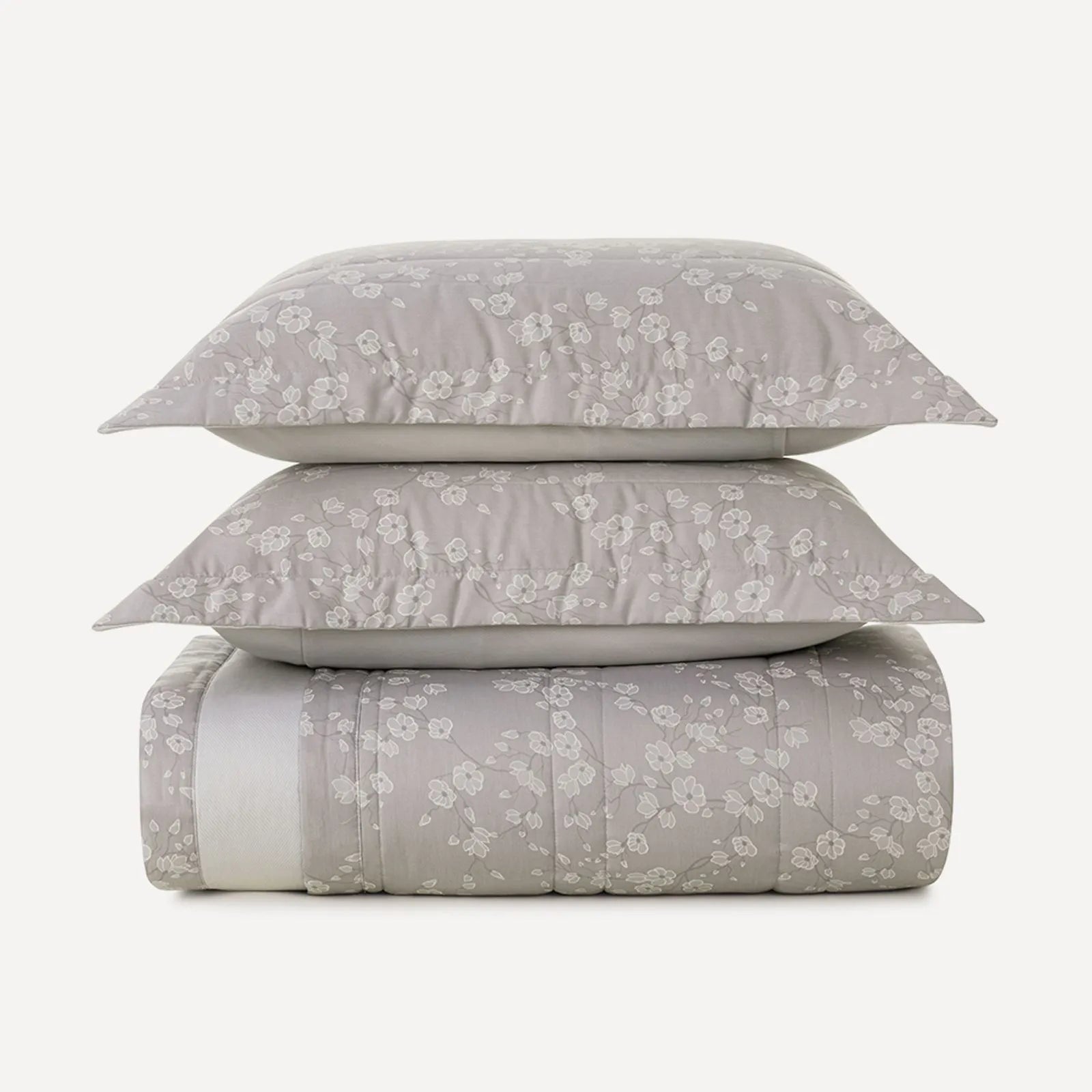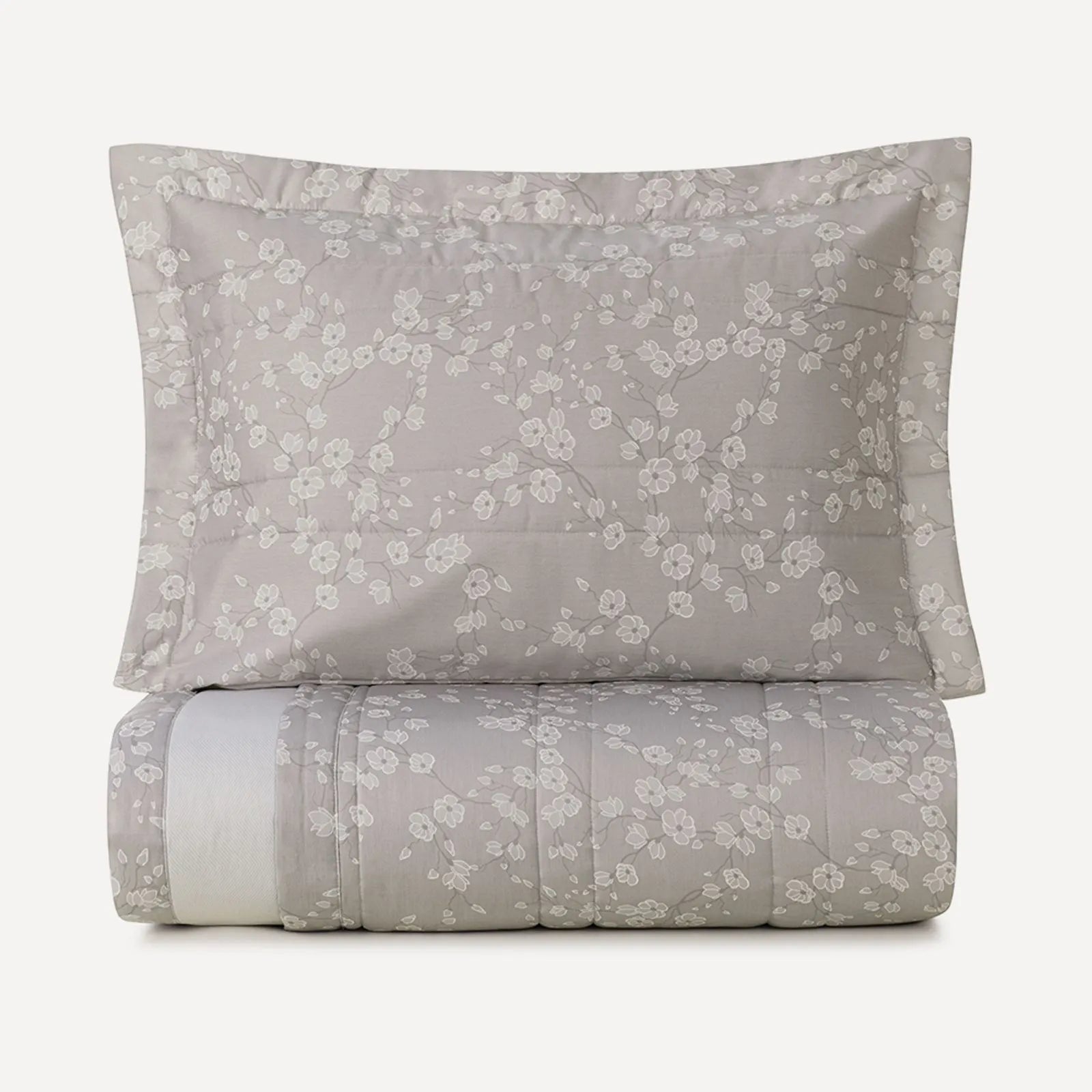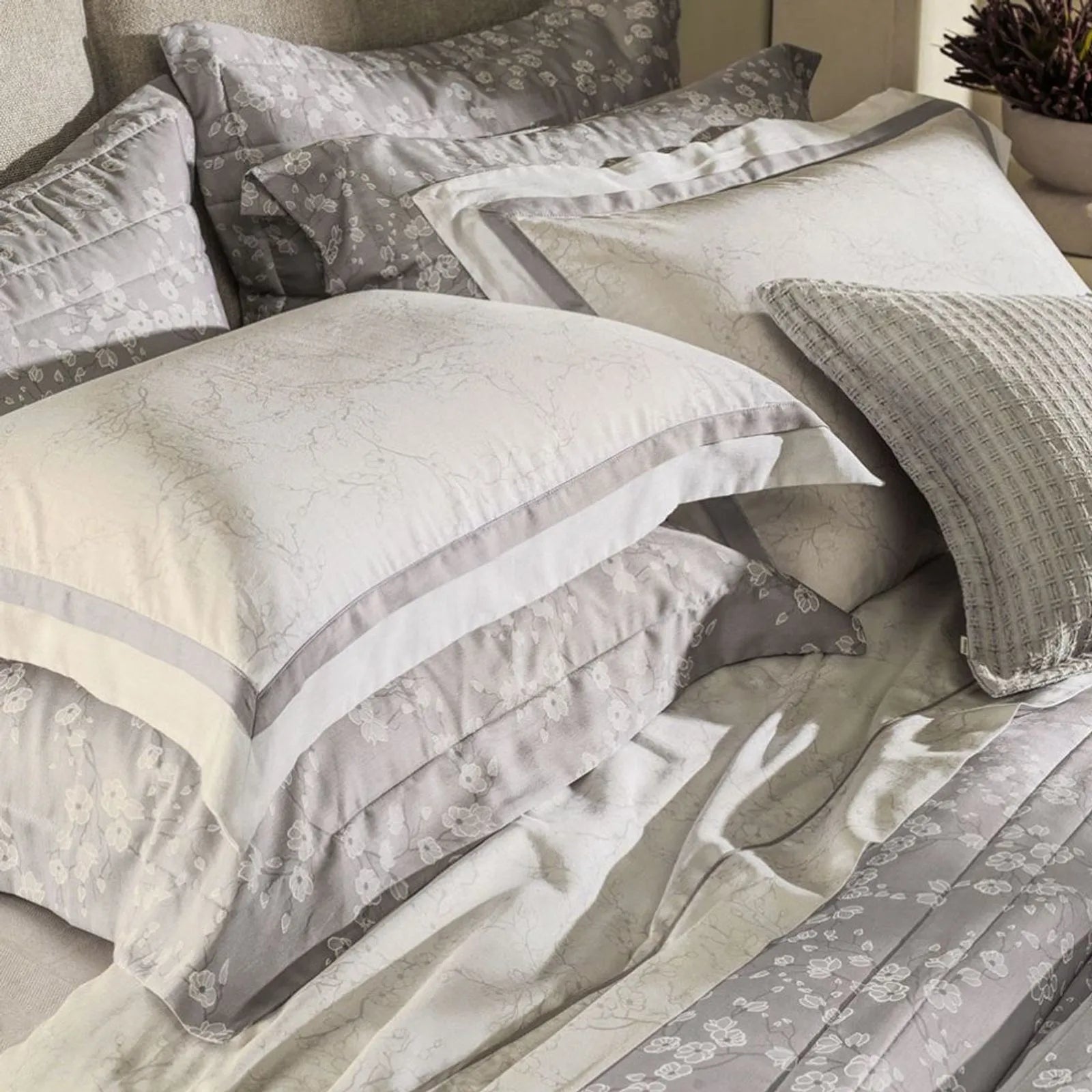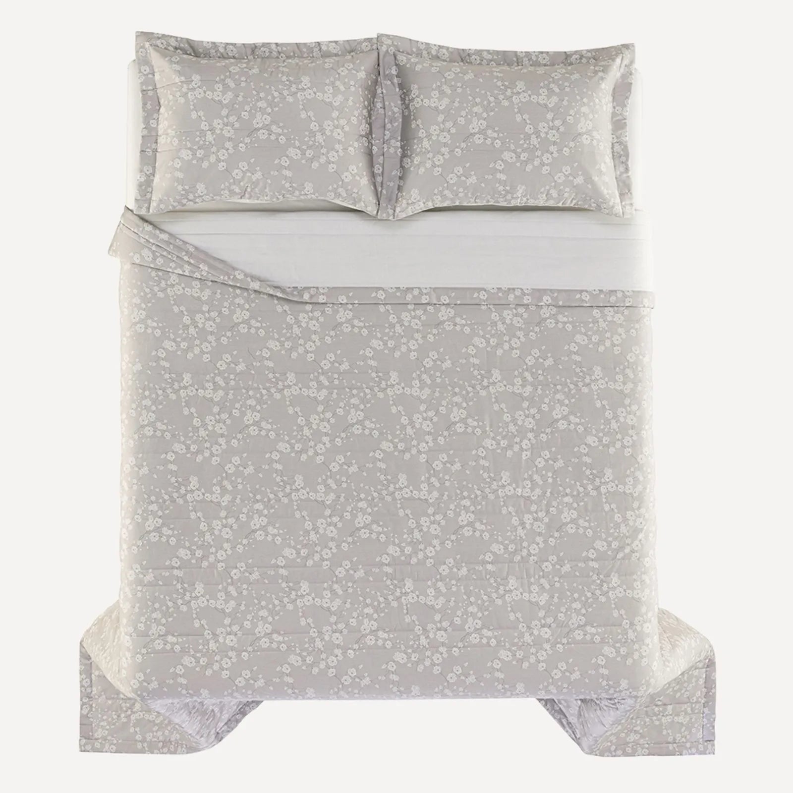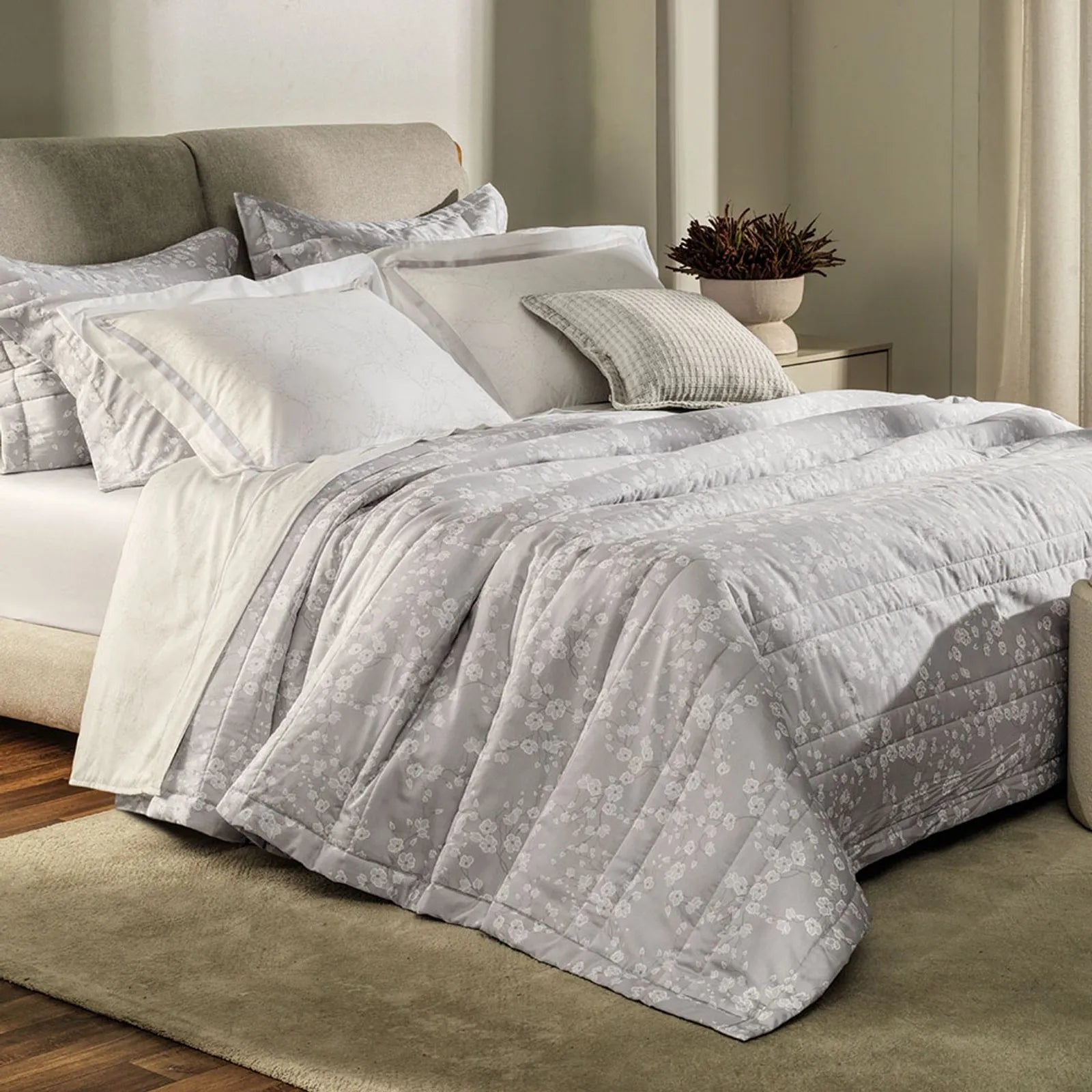 O Jogo de Colcha Melania, da sofisticada linha 300 Fios da Karsten, é a tradução da serenidade e do frescor para o dormitório. Inspirado na delicadeza da natureza, o modelo apresenta uma estampa de ramagens florais filetadas em traços finos e elegantes sobre uma base de tom cinza médio. Por ser dupla face, oferece versatilidade na decoração: enquanto a face principal exibe o floral clássico, o verso traz uma padronagem geométrica em zigue-zague super fino, permitindo alternar o visual da cama com um toque moderno e dinâmico.