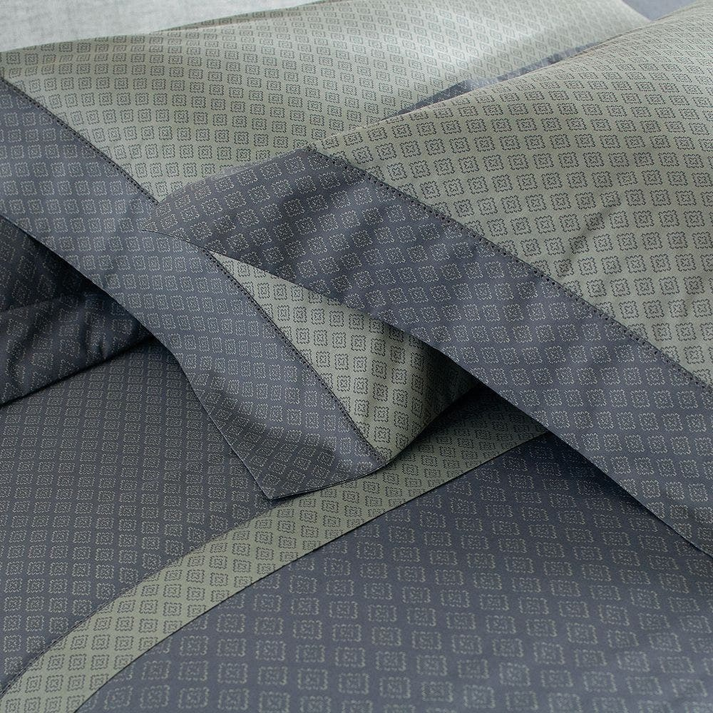 A estampa Gavin é o grande diferencial, inspirada na clássica gravataria. Apresenta uma moldura texturizada em um profundo tom de azul que contrasta harmoniosamente com a base acinzentada, conferindo um toque urbano e moderno ao ambiente. O acabamento de alta qualidade e o design cuidadosamente elaborado refletem o padrão de excelência da linha Gran Percalle da Buddemeyer.