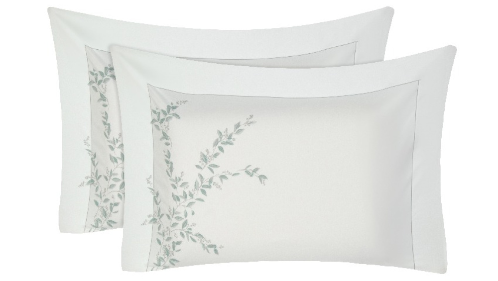 Fronhas: Estampa localizada de folhas em tons de prata e nuances de verde, com verso liso branco e acabamento com 3 abas.