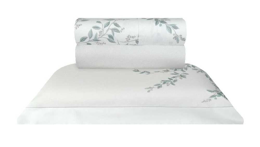 Lençol Superior: Liso, com dobra feita. O corpo e a vira possuem estampa de folhas em tons de prata e nuances de verde.