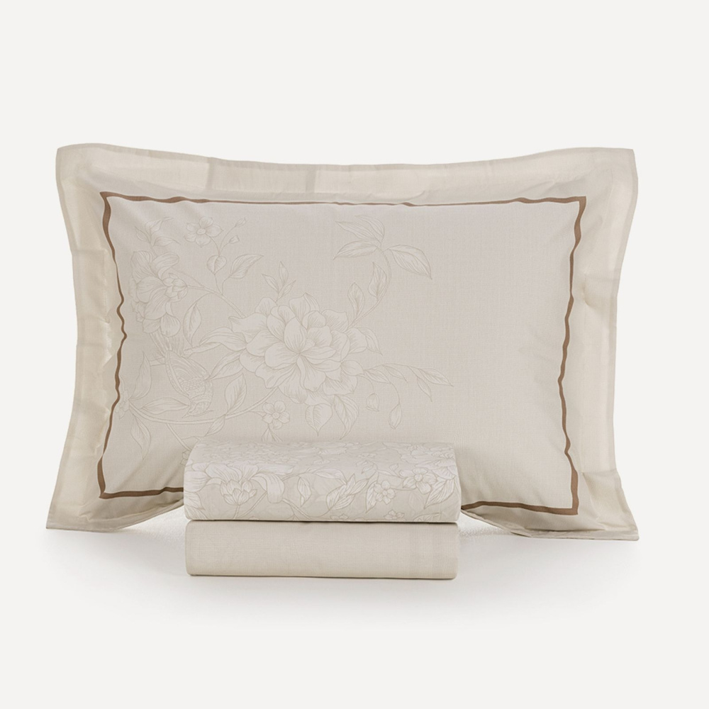 Com floral filetado em tom bege claro, o jogo de cama Mallu traz elegância natural e leveza à composição. As fronhas dimensionadas e a capa de almofada com bordado de pássaro complementam a proposta delicada. A cama Mallu traz tons de bege e marrom, que são tendência em casa e decoração. Apesar dos detalhes requintados, ela é neutra e deixa o ambiente equilibrado.