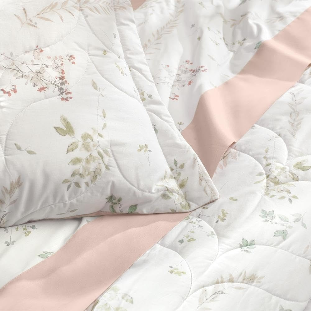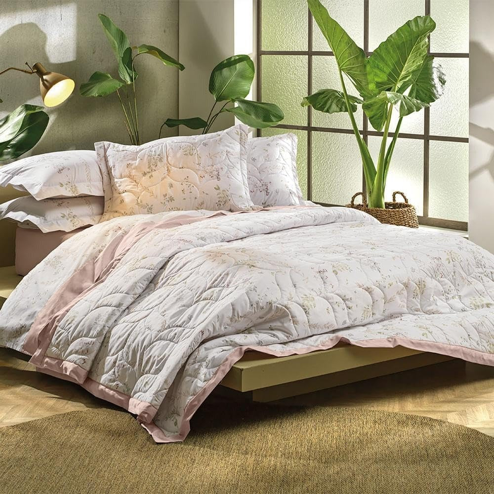 Jogo de Colcha 3 Peças Algodão Lux 200 Fios Apaixonada. Em 100% Algodão 200 Fios de toque macio, este jogo de colcha Casal de 3 peças com design Estampado (Brisa) é leve e elegante. Proporciona maciez, respirabilidade e durabilidade, ideal para um ambiente tranquilo e confortável, com resistência e um visual arejado. ESPECIFICAÇÕES TÉCNICAS: Material: 100% Algodão; Fios: 200 Fios; Cor/Estampa: Estampado Brisa (tons claros/azuis); Tamanho: Casal (Colcha aprox. 200cm x 220cm, Porta-travesseiros aprox. 50cm x 70cm); Conteúdo: 1 Colcha Casal, 2 Porta-travesseiros; Propriedades: Toque macio, leve, elegante, respirável, durável; Instruções de Cuidado: Lavar à máquina em água fria (máx. 40°C), não alvejar, secar em tambor em temperatura baixa, passar a ferro em temperatura média.