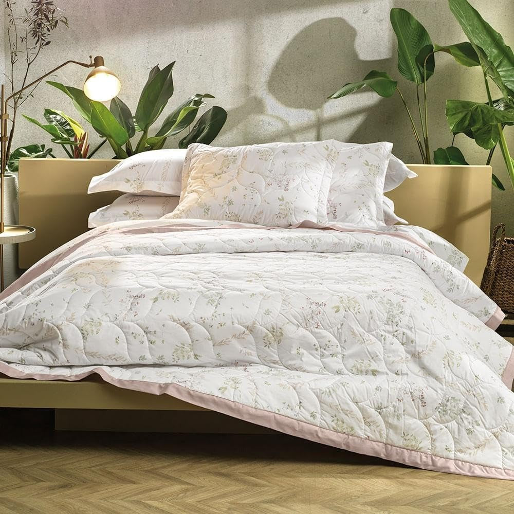 Jogo de Colcha 3 Peças Algodão Lux 200 Fios Apaixonada. Em 100% Algodão 200 Fios de toque macio, este jogo de colcha Queen de 3 peças com design Estampado (Brisa) é leve e elegante. Proporciona maciez, respirabilidade e durabilidade, ideal para um ambiente tranquilo e confortável, com resistência e um visual arejado. ESPECIFICAÇÕES TÉCNICAS: Material: 100% Algodão; Fios: 200 Fios; Cor/Estampa: Estampado Brisa (tons claros/azuis); Tamanho: Queen (Colcha aprox. 240cm x 260cm, Porta-travesseiros aprox. 50cm x 70cm); Conteúdo: 1 Colcha Queen, 2 Porta-travesseiros; Propriedades: Toque macio, leve, elegante, respirável, durável; Instruções de Cuidado: Lavar à máquina em água fria (máx. 40°C), não alvejar, secar em tambor em temperatura baixa, passar a ferro em temperatura média.