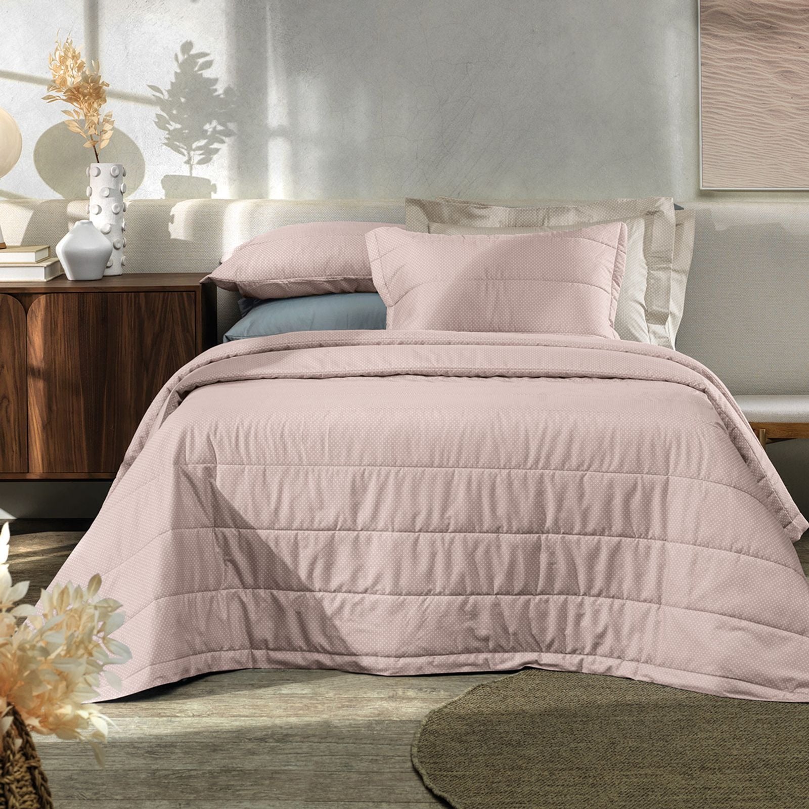 Jogo de Colcha 3 Peças Algodão Lux 200 Fios Básica. Confeccionado em 100% Algodão 200 Fios com toque suave, este jogo de colcha Casal de 3 peças na cor Rosé (Inspire) é delicada e charmosa. Proporciona maciez, respirabilidade e durabilidade, ideal para criar um ambiente acolhedor e elegante. ESPECIFICAÇÕES TÉCNICAS: Material: 100% Algodão; Fios: 200 Fios; Cor: Rosé (Inspire); Tamanho: Casal (Colcha aprox. 200cm x 220cm, Porta-travesseiros aprox. 50cm x 70cm); Conteúdo: 1 Colcha Casal, 2 Porta-travesseiros; Propriedades: Toque suave, delicada, charmosa, respirável, durável; Instruções de Cuidado: Lavar à máquina em água fria (máx. 40°C), não alvejar, secar em tambor em temperatura baixa, passar a ferro em temperatura média.