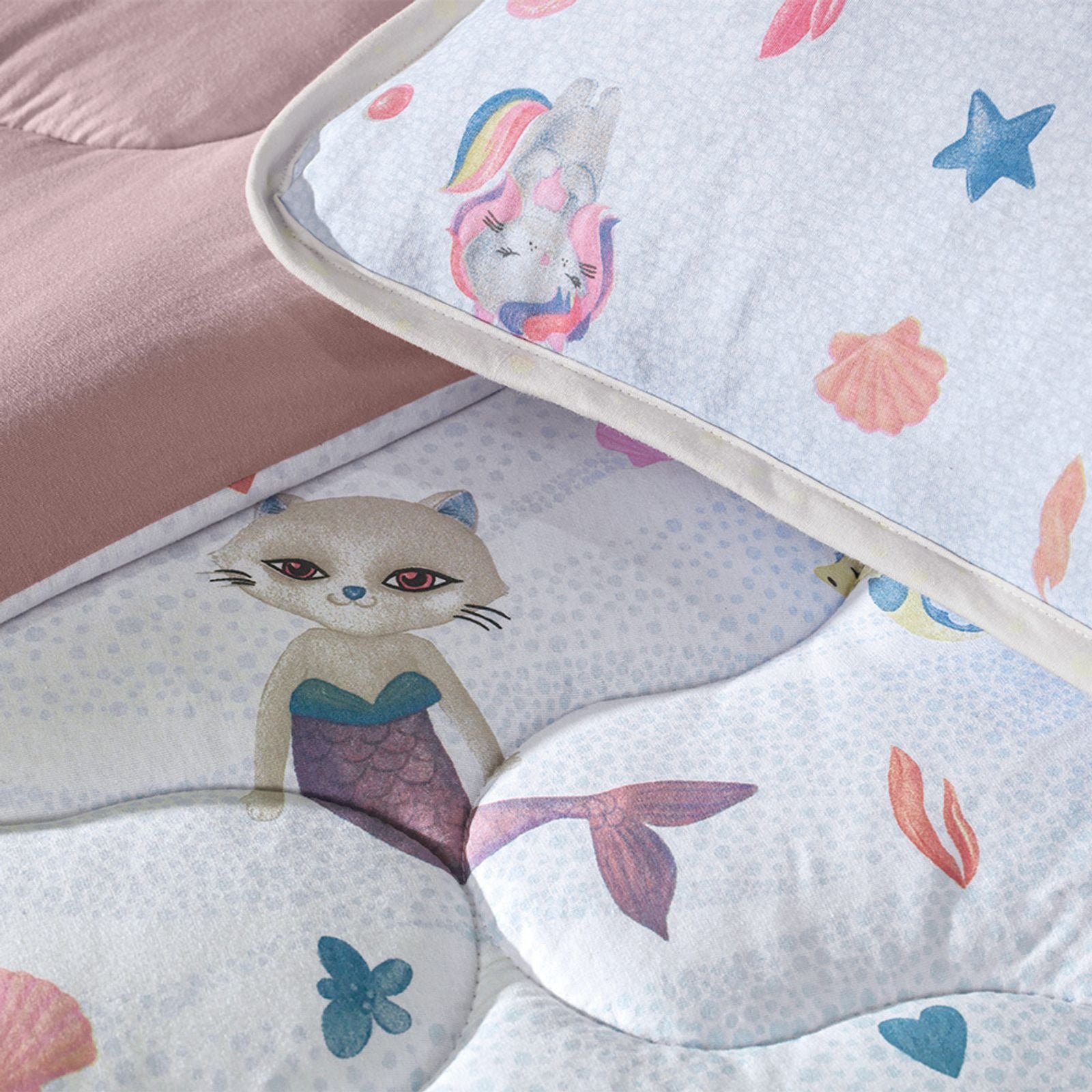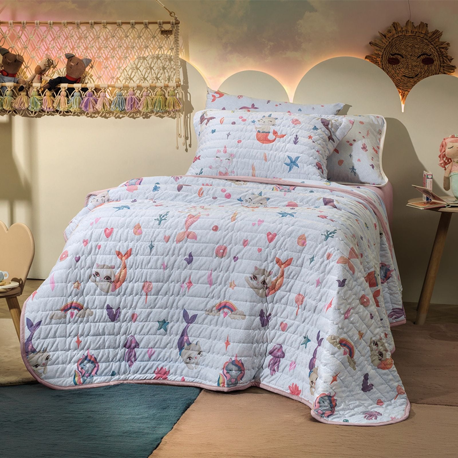 Jogo de Colcha 2 Peças Mundo Kids Malha Antialérgica. Colcha Solteiro em Malha de Algodão 100% puro suave e segura, antialérgica. O design Estampado (Mar Magia) é divertido e aconchegante, ideal para o quarto infantil, proporcionando conforto e um ambiente lúdico. ESPECIFICAÇÕES TÉCNICAS: Material: Malha 100% Algodão (externo), Enchimento 100% Poliéster (antialérgico); Fios: Malha; Cor/Estampa: Estampado Mar Magia (colorido); Tamanho: Solteiro (Colcha aprox. 160cm x 220cm, Porta-travesseiro aprox. 50cm x 70cm); Conteúdo: 1 Colcha Solteiro, 1 Porta-travesseiro; Propriedades: Antialérgica, suave, divertida, aconchegante, segura, respirável; Instruções de Cuidado: Lavar à máquina em água fria (máx. 40°C), não alvejar, secar em tambor em temperatura baixa.