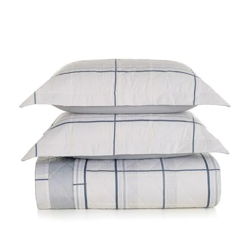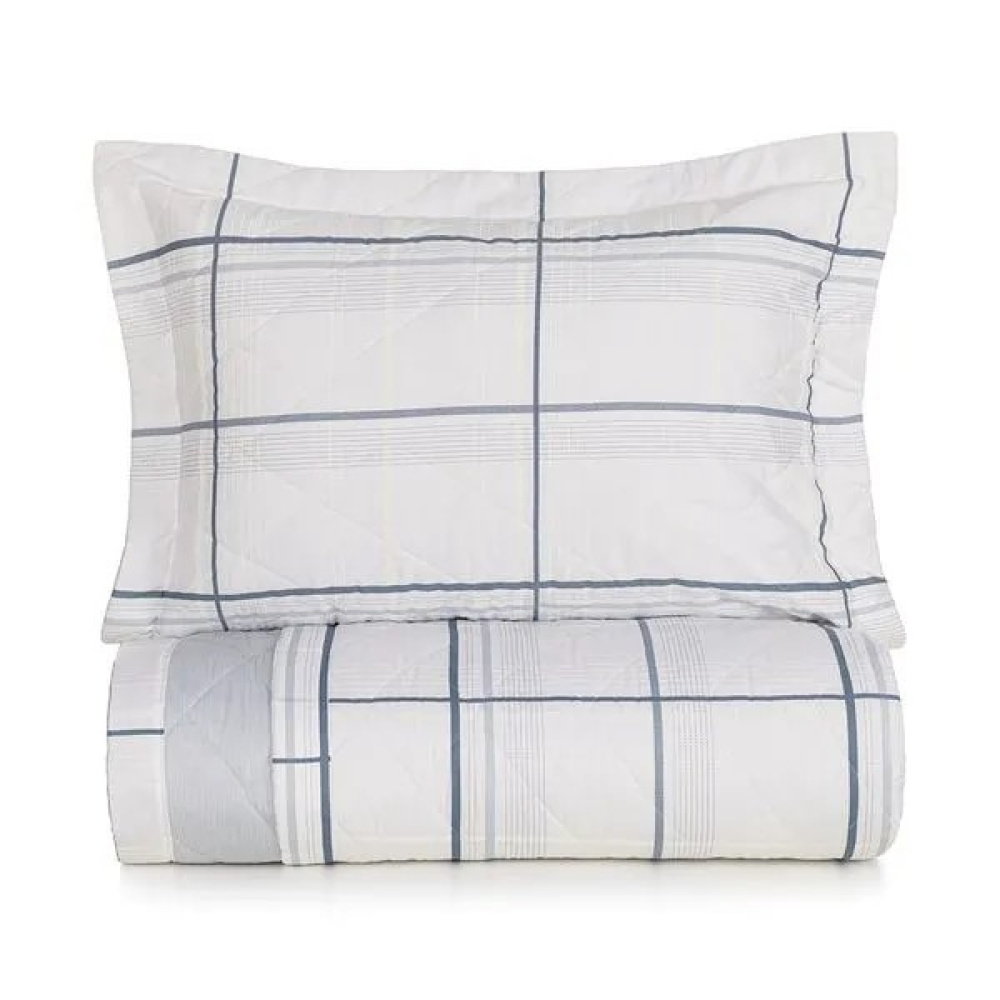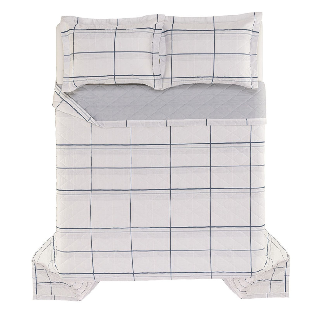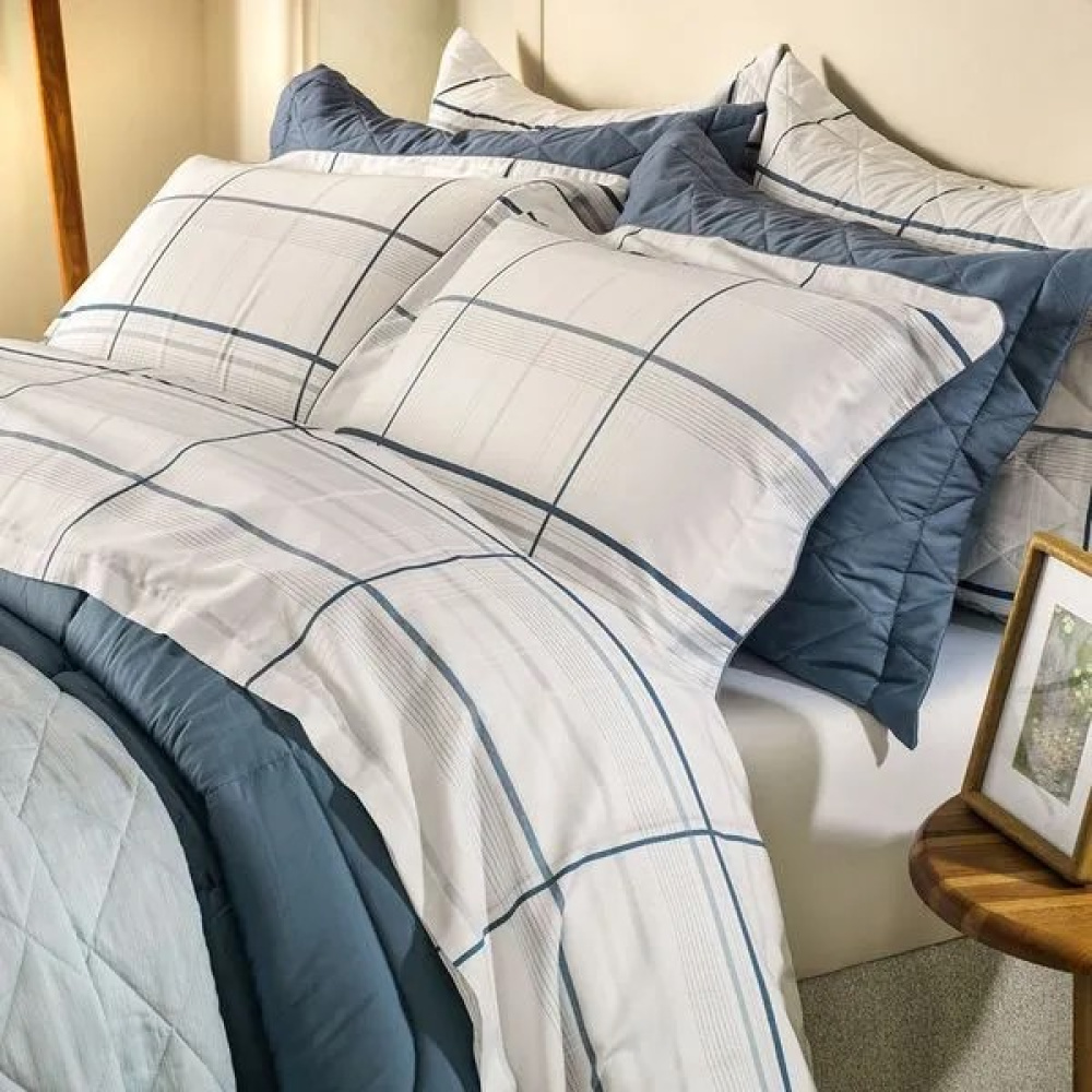 A colcha, com medidas de 2,40m x 2,60m, é dupla face e tem cantos quadrados, o que dá um toque de sofisticação e versatilidade. Os porta-travesseiros (50cm x 70cm), com três abas de 5 cm, têm um acabamento impecável e elegância discreta. A estampa em tons de azul e branco se integra harmoniosamente a diversos estilos de decoração.