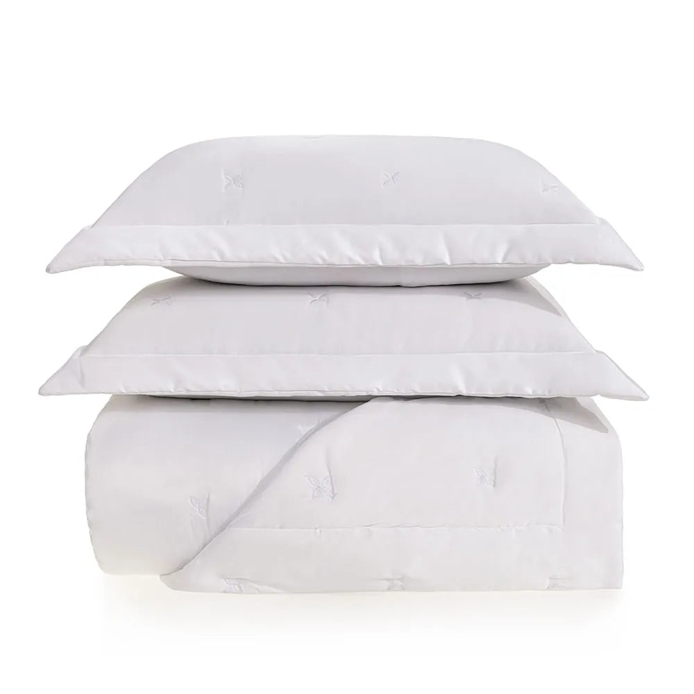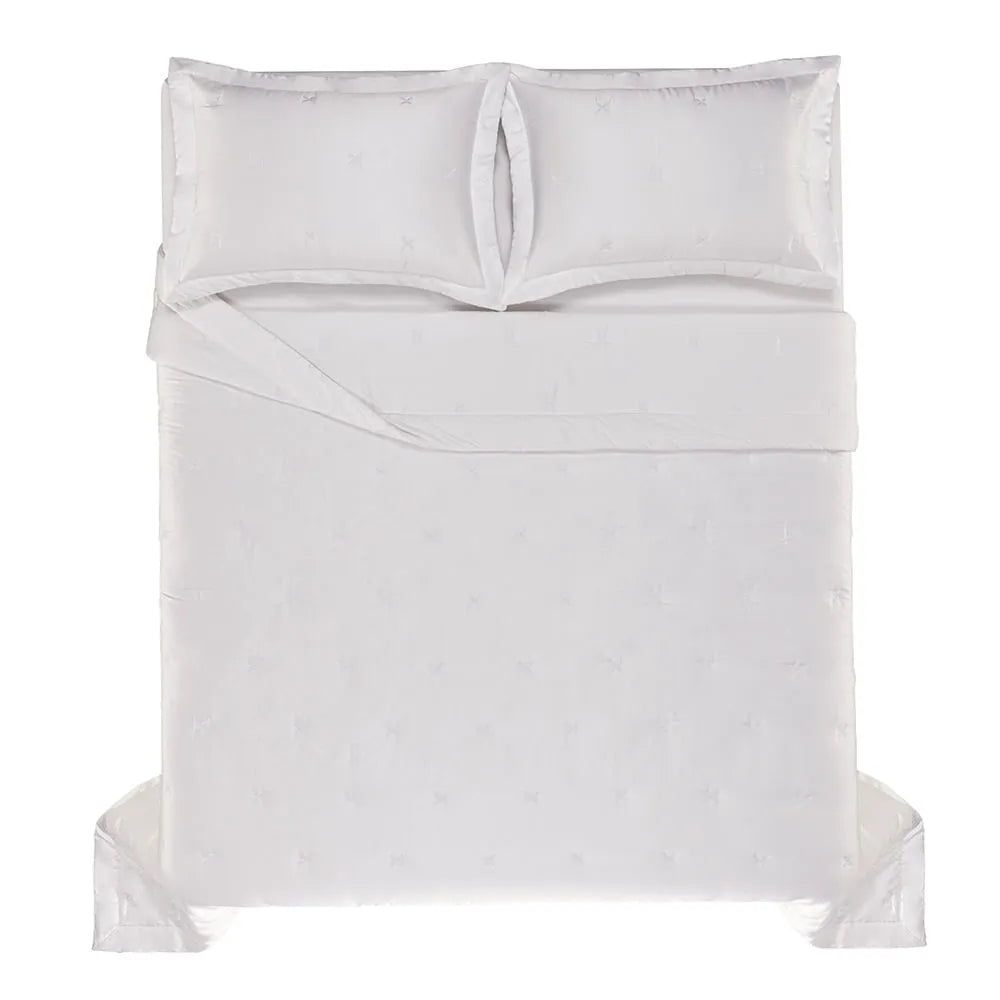 Design Bordado: O corpo da colcha e os porta-travesseiros exibem bordados em branco sobre branco, criando uma textura rica e elegante sem perder a neutralidade;