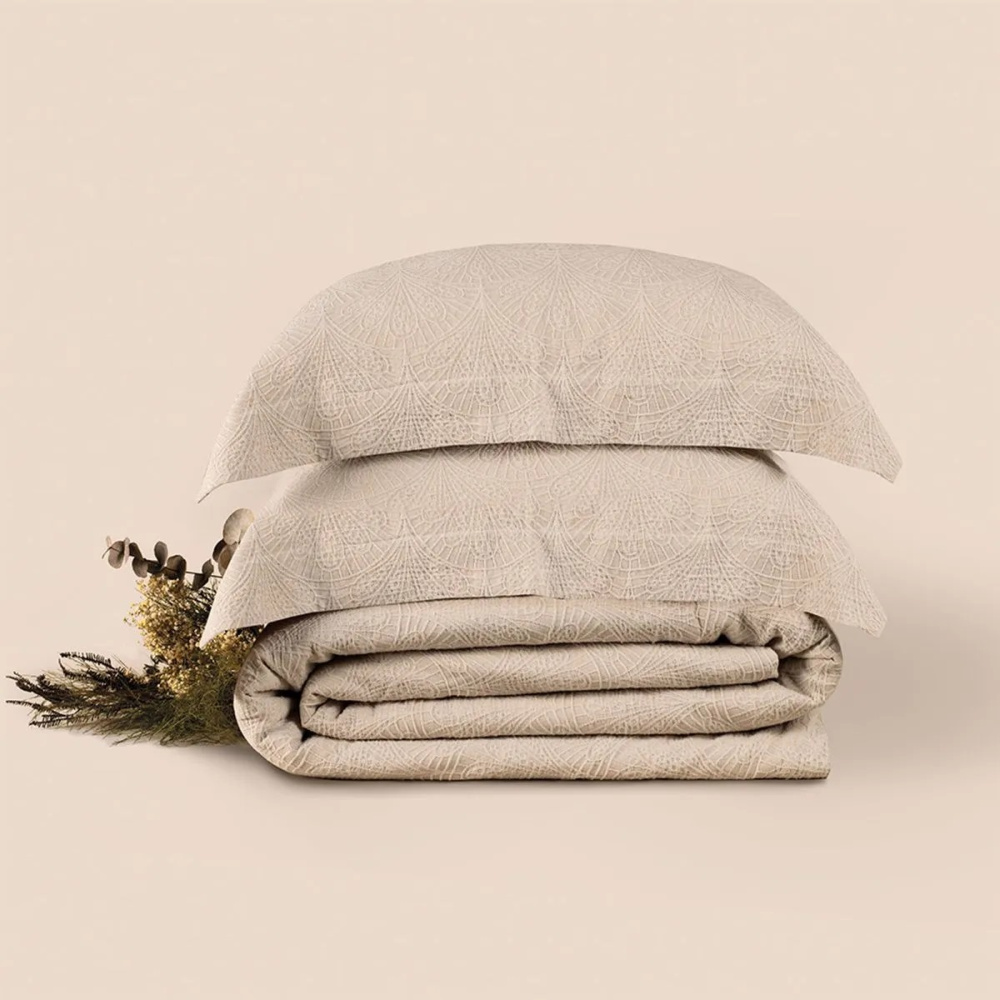 • Acabamento: Fio Tinto, com desenhos em Jacquard no lado superior e Cetim 300 Fios liso no lado inferior