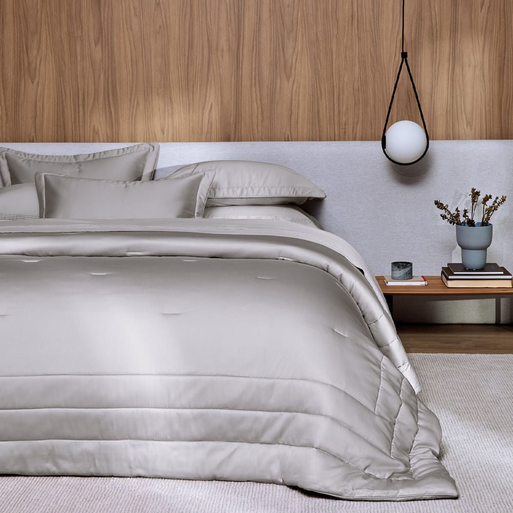 Design Significativo: O matelassado de três linhas confere textura e um volume que enriquece a composição da cama.