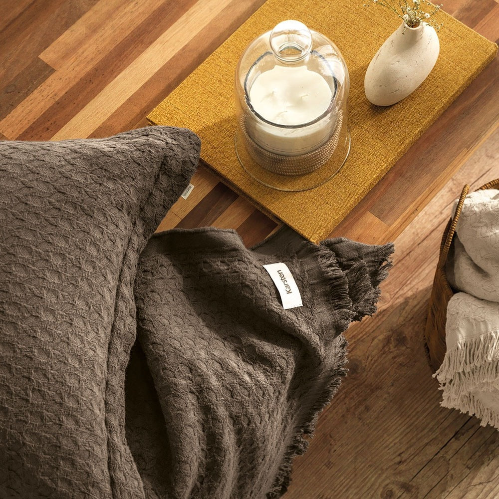 O design da manta apresenta uma textura em relevo e um elegante acabamento com franjas nas extremidades, conferindo charme e sofisticação ao ambiente.