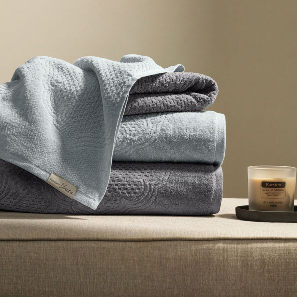 Acabamento: Toque super macio; Super absorção; Pré-encolhido; Antipilling; Corpo aveludado em jacquard; Tecnologia Unika; Tecnologia Softmax; Etiqueta Diferenciada.